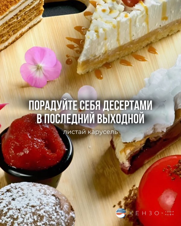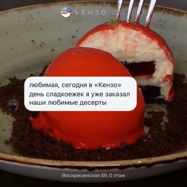 Вы уже слышали, что воскресенье — это день, когда можно позволить себе немного больше сладости, чем обычно? Приглашаем вас и вашу вторую половинку в «Кензо» насладиться вкуснейшими десертами из нашего меню Ждём вас по адресу: Воскресенская 59, 0 этаж