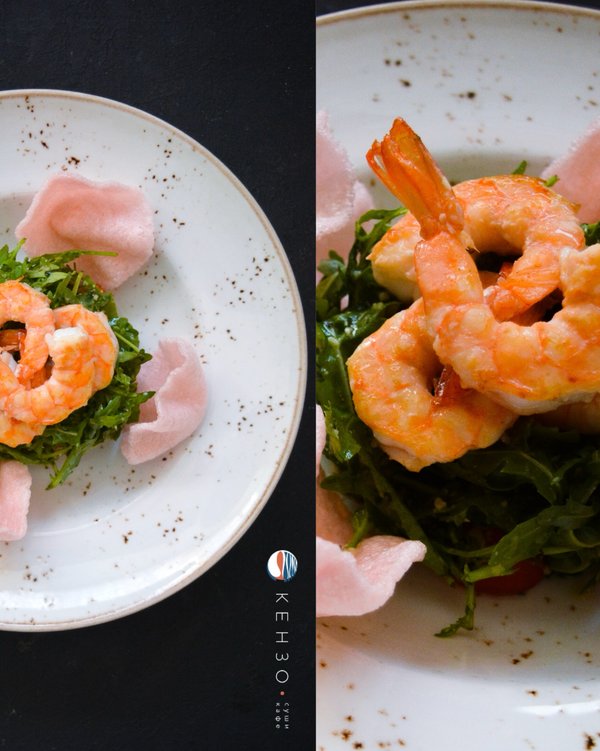 Собирайтесь без повода в КЕНЗО|Суши-кафе ️ Салат с креветкой и рукколой Тигровая креветка, руккола,томаты Черри,рисовые чипсы, сок лимона,чеснок и невероятный соус Песто