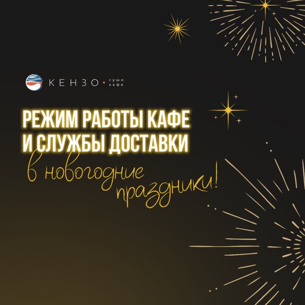 Новогодний режим работы суши-кафе «Кензо» Дорогие гости, чтобы вы могли заранее спланировать свои праздники, делимся нашим графиком работы в новогодние дни: До 31.12 — работаем в штатном режиме. Зал: 31.12 и 01.01 — закрыт 02.01 — 14:00–23:00 (дневное меню и акции приостановлены) 03.01–11.01 — 12:00–23:00 (дневное меню и акции приостановлены) Доставка: 31.12 — 10:30–17:00 01.01 — не работает 02.01 — 14:00–23:00 (дневное меню и акции приостановлены) 03.01–11.01 — 12:00–23:00 (дневное меню и акции приостановлены)