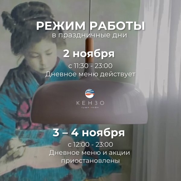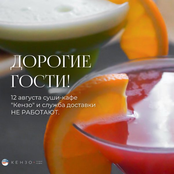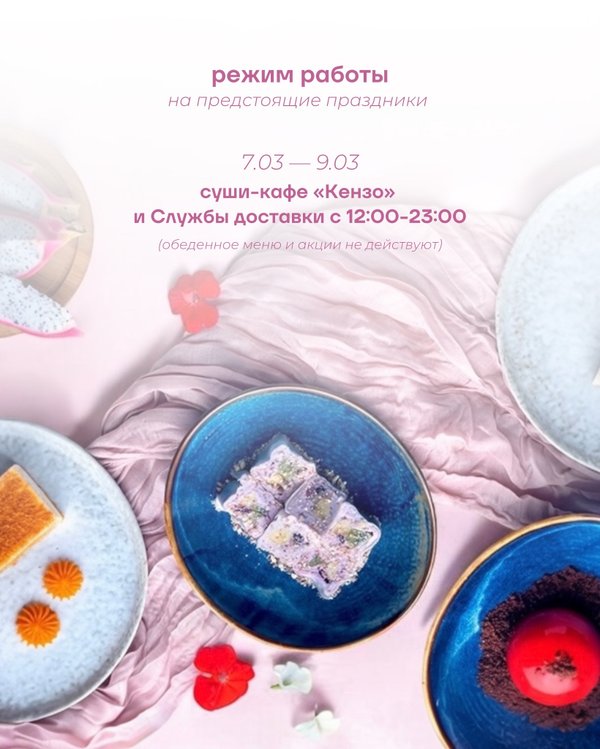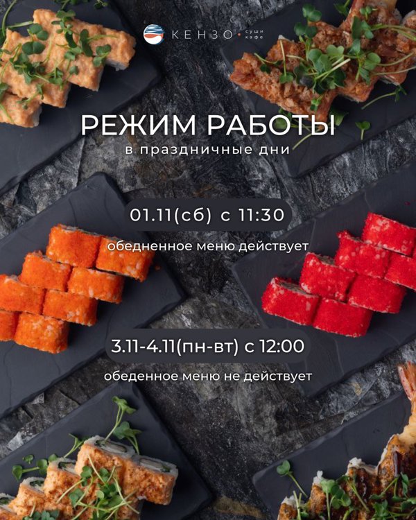 Дорогие гости! Совсем скоро праздничные дни, просьба ознакомиться с режимом работы заведения С ув.администрация суши-кафе «Кензо» бронь: служба доставки: