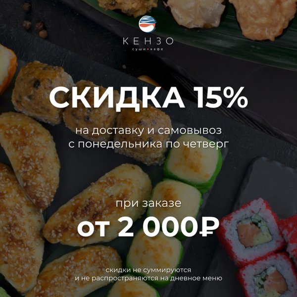 Рады напомнить о нашей акции! Получи скидку 15% на доставку и самовывоз с понедельника по четверг! Закажи любимые роллы, сеты и супы с понедельника по четверг и получи приятный бонус к своему ужину! Отличный способ сэкономить и насладиться свежей, вкусной едой из Кензо Успей воспользоваться выгодным предложением! Работаем для вас с 11:30 до 23:00
