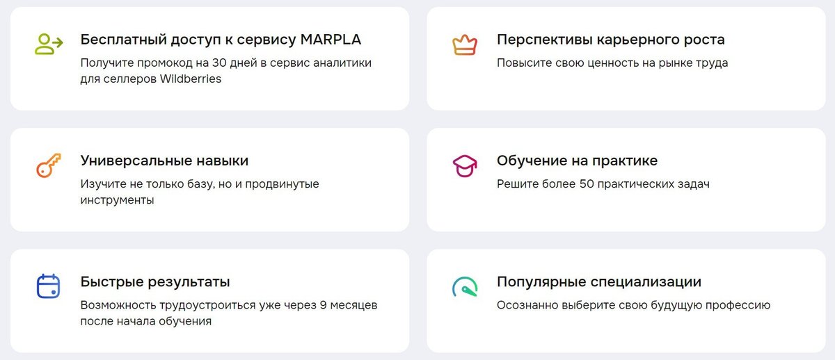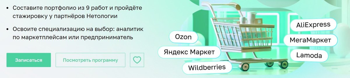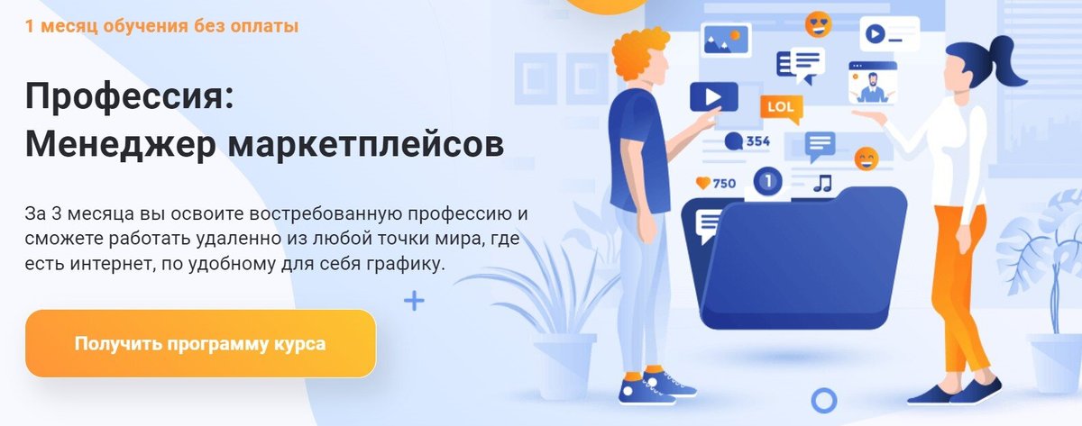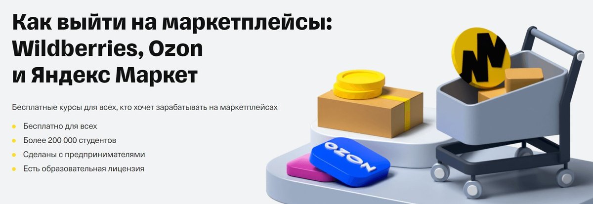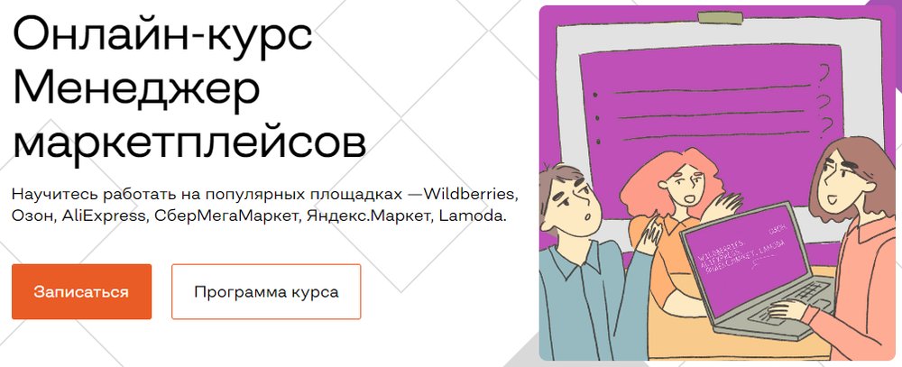 Одна из ведущих российских компаний в области образования разработала полугодовой курс начинающих менеджеров маркетплейсов со стажировкой и последующим трудоустройством. Формат обучения — вебинары экспертов, видеолекции и выполнение домашних заданий. За дополнительную плату можно освоить продвинутую аналитику и бизнес на маркетплейсах.