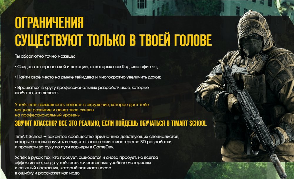 Course3D (TimArt School) — международная школа по подготовке специалистов 3D-моделирования для геймдева. Курс «3D-Дженералист» разработан с акцентом на разработку игровых персонажей и ассетов и подходит новичкам и дизайнерам, желающим прокачать свои навыки, найти высокооплачиваемую работу или создавать инди-игры. Формат обучения необычный — слушатели оплачивают трехмесячную подписку на курс, а затем могут выбирать материалы и решать задачи, соответствующие их уровню подготовки. Общение с кураторами проходит в сообществе, где можно задать любой вопрос. Еженедельно проводятся стримы.