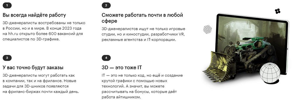 | Что входит | 10+ часов занятий в неделю с учетом выполнения практических заданий, проверка работ кураторами, месяц стажировки в геймдеве или студии 3D-дизайна, участие в комьюнити студентов, помощь координаторов по всем вопросам, содействие в поиске работы. |