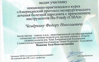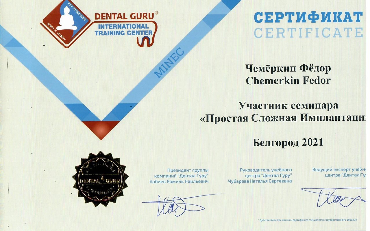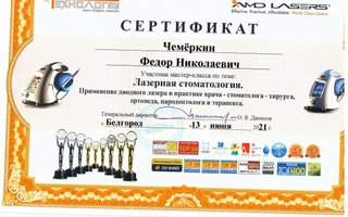Главный врач, врач стоматолог-ортопед, стоматолог -хирургЧемёркин Федор Николаевич является стоматологом-ортопедом, а также работает в сфере стоматологической хирургии и имплантологии. Федор Чемёркин в том числе занимается лечением кариеса, периостита, периодонтита, кист зубов и гингивита, выполняет несъемное и съемное протезирование зубов, снятие зубного камня, шинирование зубов, герметизацию фиссур и микропротезирование зубов, а также проводит отбеливание зубов, реставрацию зубов, эндодонтическое лечение, профессиональную гигиену полости рта и реминерализирующую терапию зубов.... Показать еще