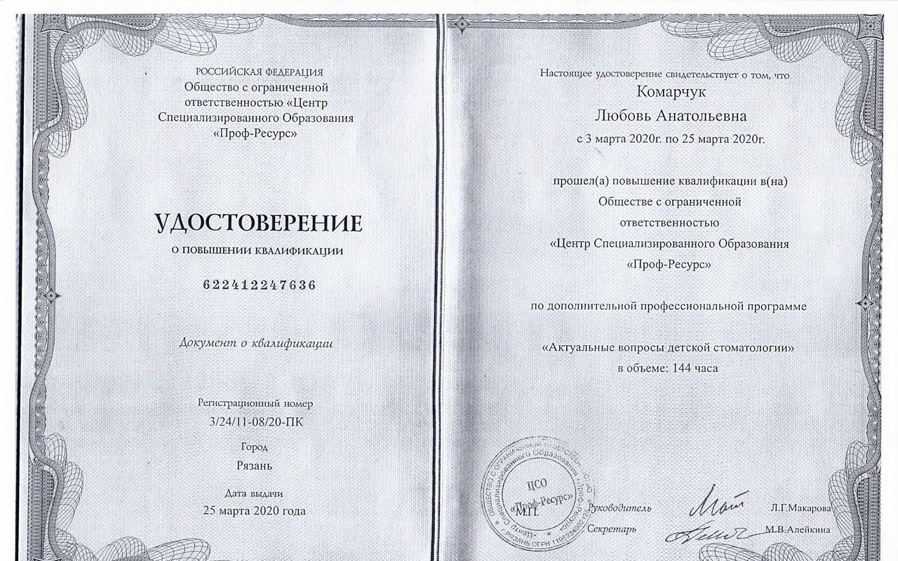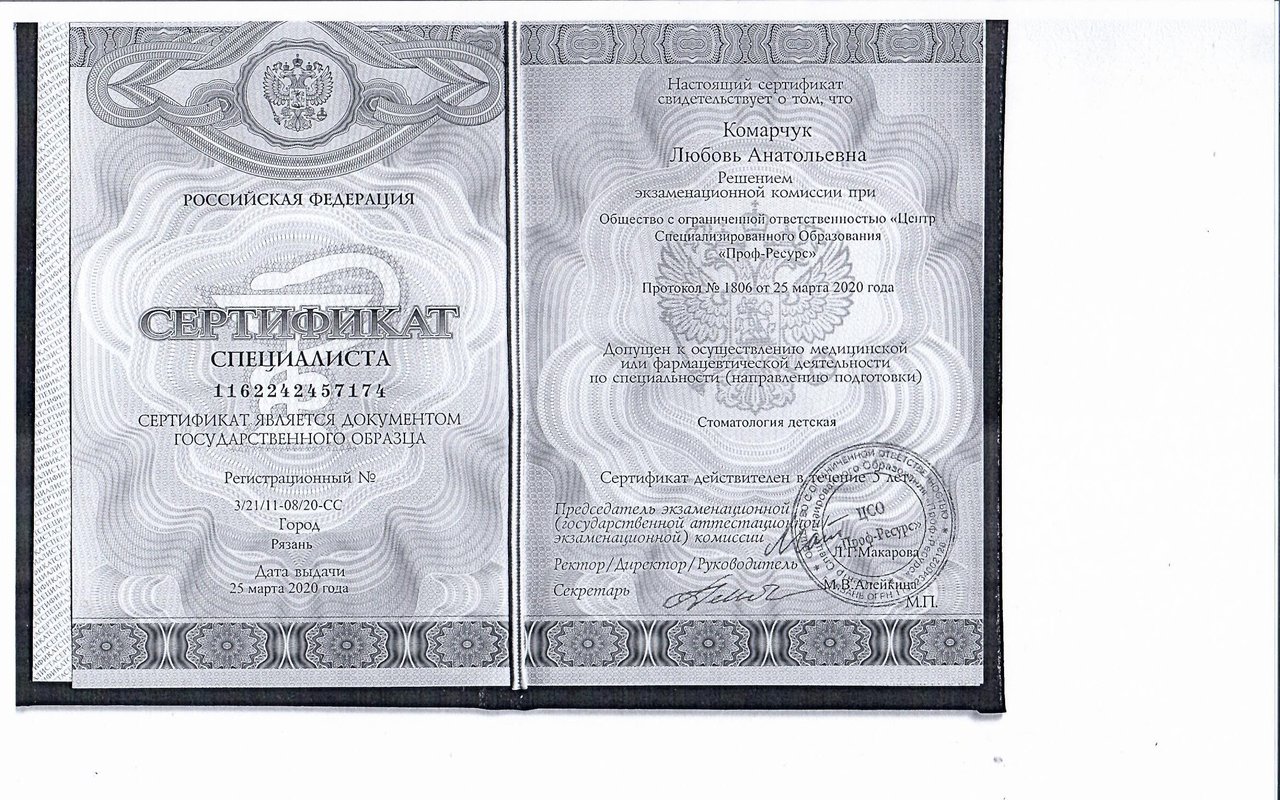2020 — Сертификат № 1162242457174 по детской стоматологии