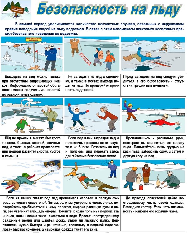 вием безопасного пребывания человека на льду является соответствие толщины льда прилагаемой нагрузке: — толщина льда для одного человека не менее 7 см; — для группового перехода 15 см и более; — для массового перехода – 25 см. Прочность льда можно определить визуально: самым прочным считается лед голубого цвета; прочность белого льда в 2 раза меньше; лед серый и матово-белый или с желтоватым оттенком не надежен. Особую осторожность нужно проявлять, когда лед покроется толстым слоем снега, перекрыв доступ холода ко льду. Правила поведения на льду : Ни в коем случае нельзя выходить на лед в темное время суток и при плохой видимости (туман, снегопад). Безопаснее всего выходить на берег и спускаться в местах, где лед виден и не покрыт снегом. При вынужденном переходе водоема безопаснее всего придерживаться проторенных троп или идти по уже проложенной лыжне, или пользоваться ледовыми переправами. Но если их нет, надо перед тем, как спуститься на лед, очень внимательно осмотреться и наметить предстоящий маршрут. Замерший водоем лучше перейти на лыжах, при этом: крепления лыж должны быть расстегнуты, чтобы при необходимости их можно было сбросить; лыжные палки держите в руках, не накидывая петли на кисти рук. Если есть рюкзак или ранец, повесьте его на одно плечо, это позволит легко освободиться от груза в случае, если лед под вами провалился. Если Вы передвигаетесь группой, то двигаться нужно друг за другом, сохраняя интервал не менее 5 — 6 метров, также необходимо быть готовым оказать помощь товарищу. Не приближайтесь к тем местам, где растут деревья, кусты, камыши, торчат коряги, где ручьи впадают в реки, происходит сброс теплых вод с промышленных предприятий. Здесь наиболее вероятно провалиться под лед. Не следует ходить рядом с трещинами или по участку льда, отделенному от основного массива несколькими трещинами. Необходимо быстро покинуть опасное место, если из пробитой лунки начинает бить фонтаном вода. Нельзя проверять прочность льда ударом ноги. Если после первого сильного удара поленом или лыжной палкой покажется хоть немного воды — это означает, что лед тонкий, по нему ходить нельзя. В этом случае немедленно отойти по своему же следу к берегу, скользящими шагами, не отрывая ног ото льда и расставив их на ширину плеч, чтобы нагрузка распределялась на большую площадь. Точно так же поступают при предостерегающем потрескивании льда и образовании в нем трещин. Уважаемые дети и взрослые Во избежание трагических случаев: Соблюдайте элементарные правила безопасности на льду. Запрещается ходить рядом с любыми водными сооружениями, в местах впадения в водоем ручьев и рек. Родители, не оставляйте детей без присмотра! Будьте внимательны к окружающим! Если вы стали свидетелем происшествия, немедленно сообщите об этом по телефону 112. По возможности окажите пострадавшему первую помощь и ждите прибытия спасателей.