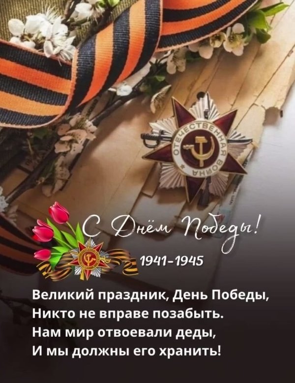 Уважаемые ветераны и дорогие друзья! В этот день мы отмечаем величайшую Победу, которая навсегда останется в нашей истории. Пусть память о тех, кто сражался за нашу свободу, будет вечной. Желаем вам крепкого здоровья, счастья и мирного неба над головой. С Днём Победы!