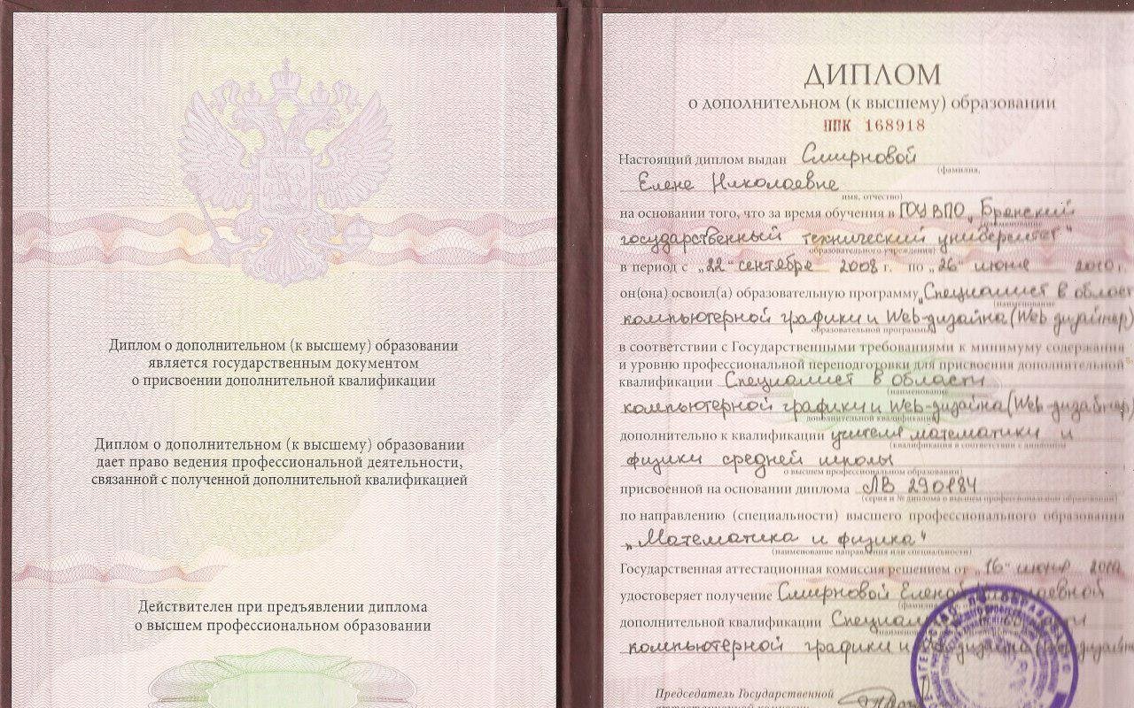Диплом специалиста в области компьютерной графики и веб-дизайна, 2010 год, БГТУ