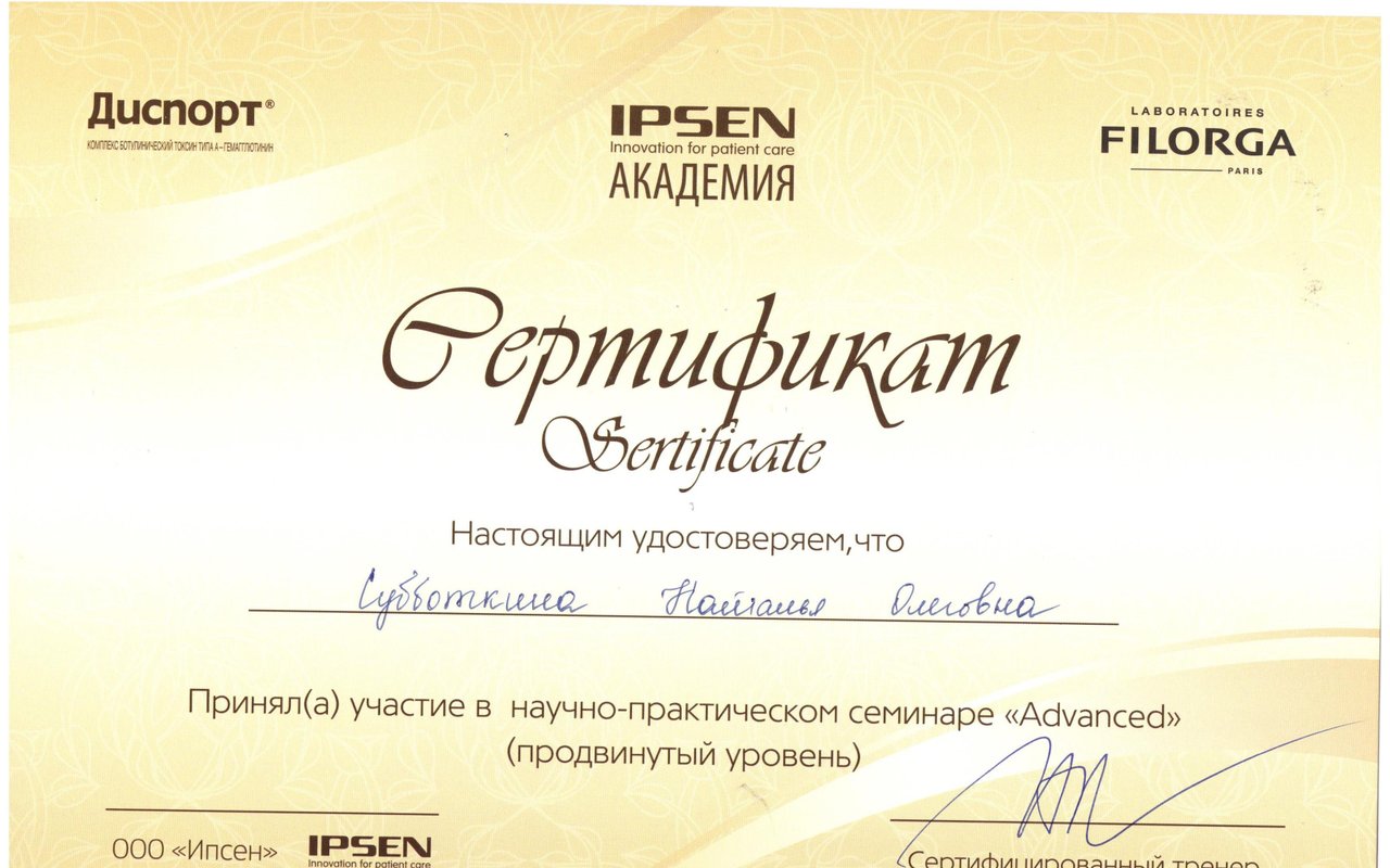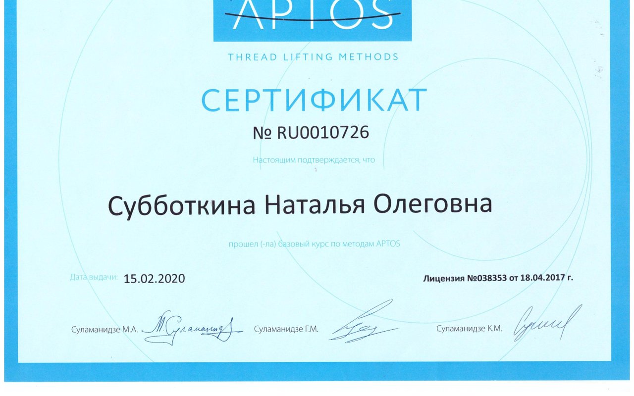 Регулярно проходит курсы повышения квалификации по косметологии, посещает тренинги, анатомические семинары и мастер-классы, как в России, так и за рубежом
