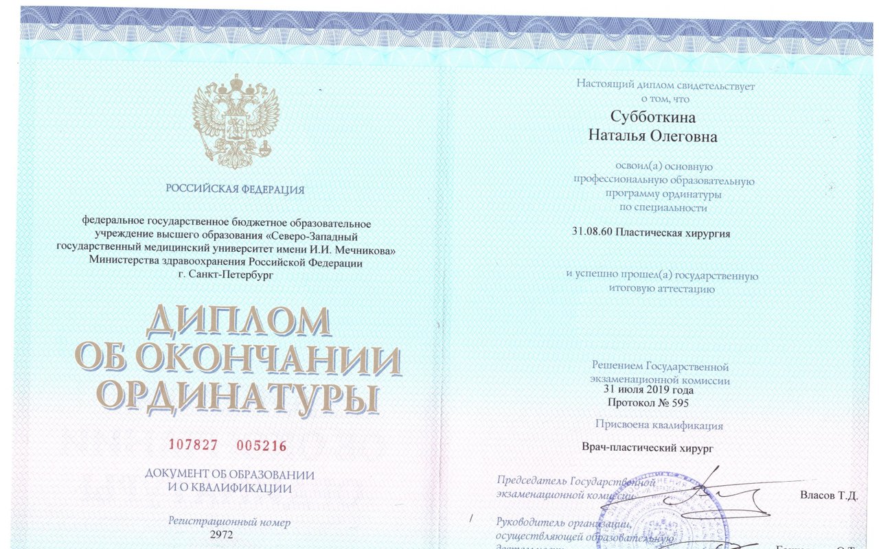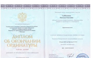 В 2016 году с отличием закончила университет имени Ульянова по специальности «Лечебное дело». Затем прошла интернатуру по специальности «Дерматовенерология», закончила Российский Университет Дружбы Народов по специальности «Косметология», а также прошла ординатуру по специальности «Пластическая хирургия» в СЗГМУ им. И.И.Мечникова