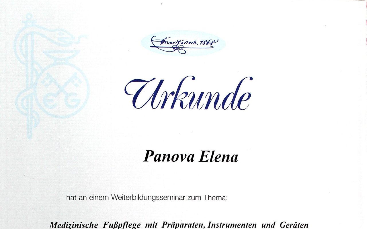 Елена Олеговна занимается подологией с 2001 года, с 2004 является методистом по аппаратному педикюру и ортониксии компании "НЭТ ЛАЙН XXI век" (Москва). Неоднократный спикер первых подологических конгрессов. В 2016 году сдала экзамен на специалиста школы подологии RUCK (Германия), а в 2016 стала их официальным референтом по ортониксии с правом выдачи сертификата школы RUCK.