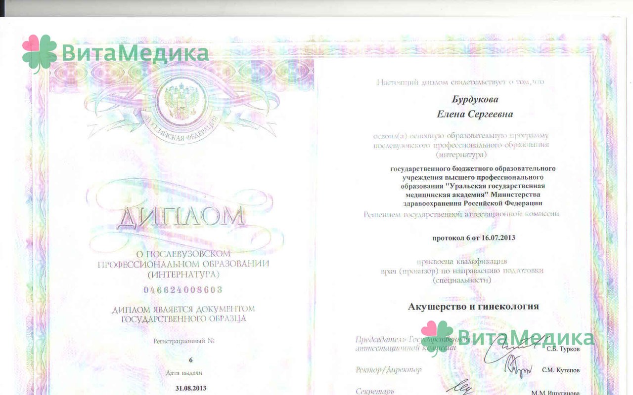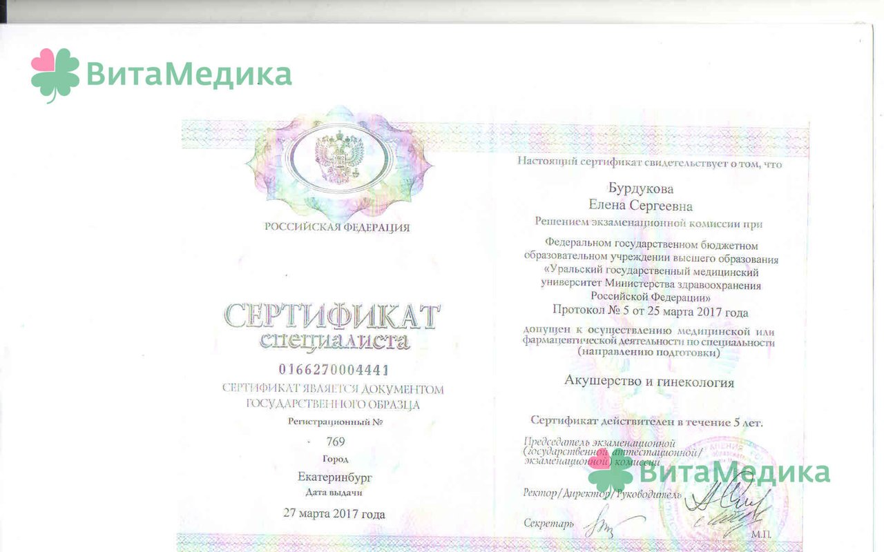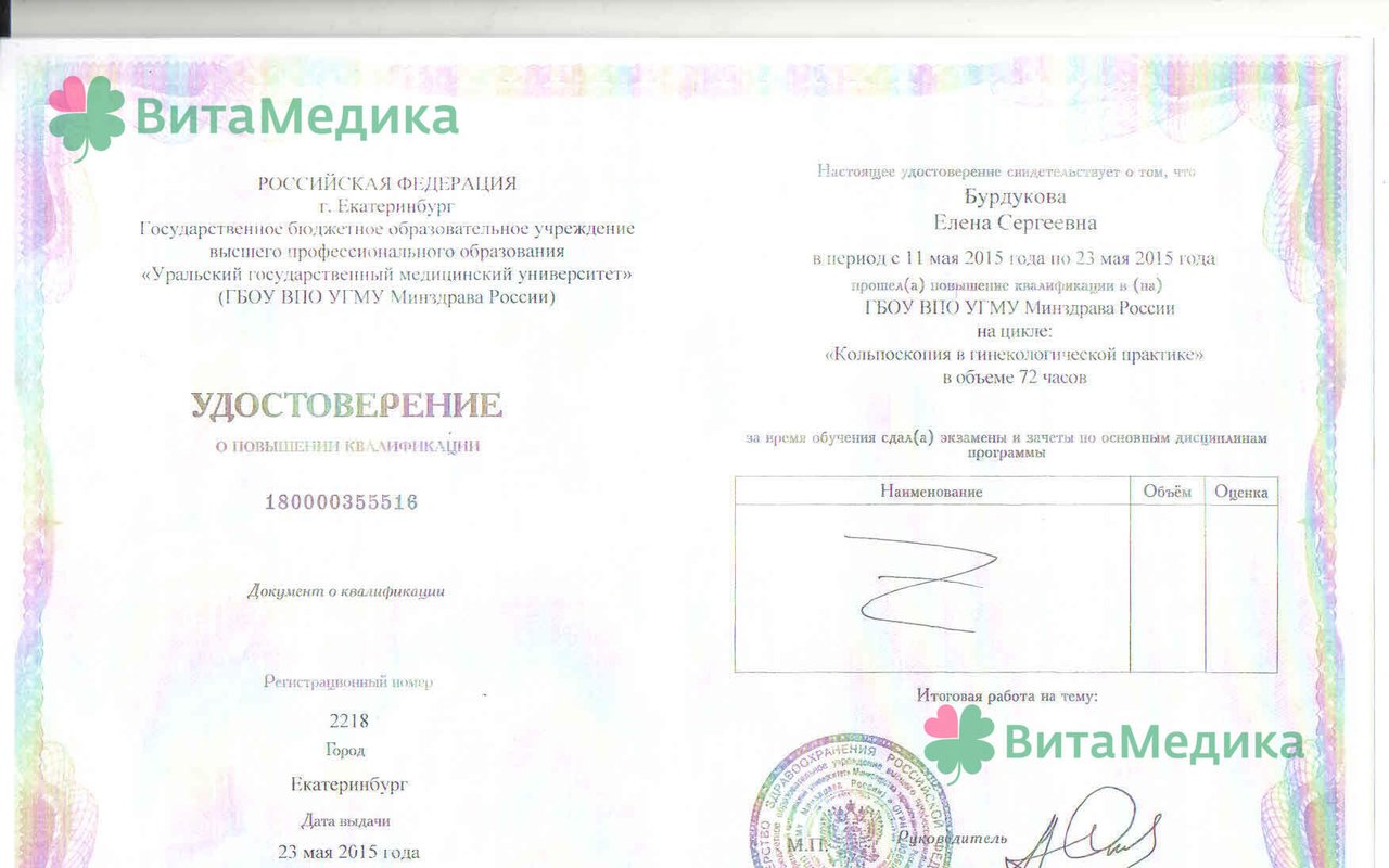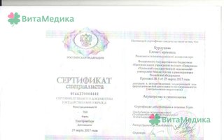 2015 - повышение квалификации по программе "Кольпоскопия в гинекологической практике", УГМУ; 2017 - повышение квалификации на цикле "Эндокринология в акушерстве и гинекологии", УГМУ