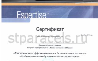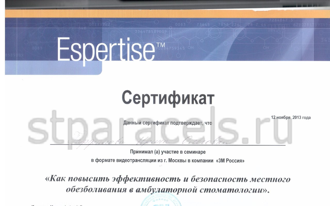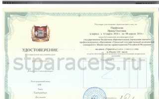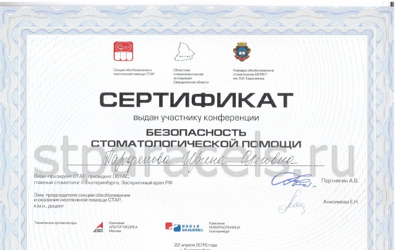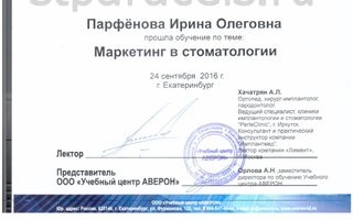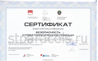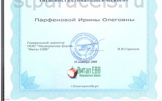 Успешно прошла интернатуру на базе Свердловского Государственного Медицинского Института, где была присвоена квалификация врач-стоматолог по специальности " Стоматология терапевтическая" (1994-1995 гг.)