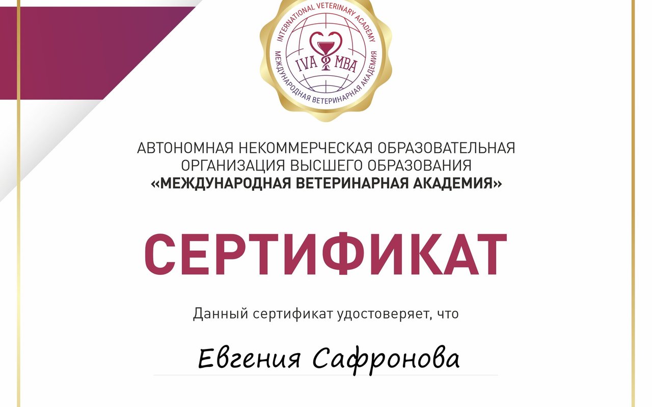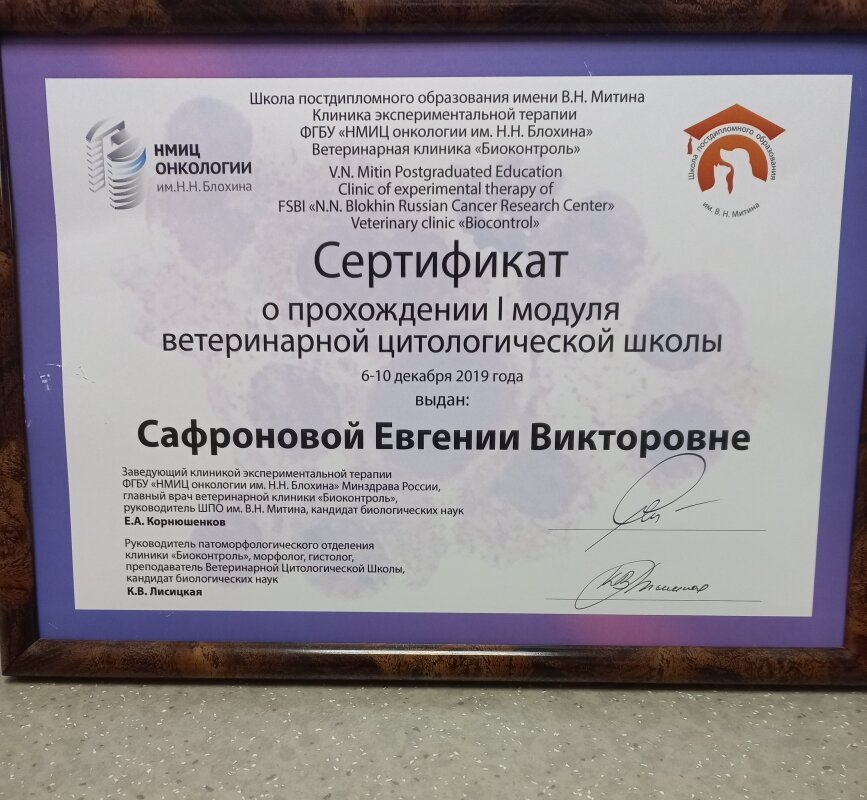 2015 — ООО «Уралбиовет-Консалтинг» сертификат на тему: «Цитологическая диагностика воспалительных процессов и онкологических заболеваний мелких домашних животных» с 03 марта по 08 апреля 2015 года