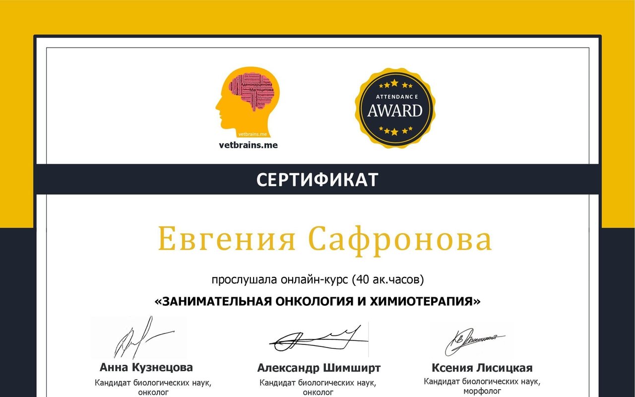 2015 — ООО «Уралбиовет-Консалтинг» сертификат на тему: «Частная онкология для практикующих ветеринаров» июль 2015 года
