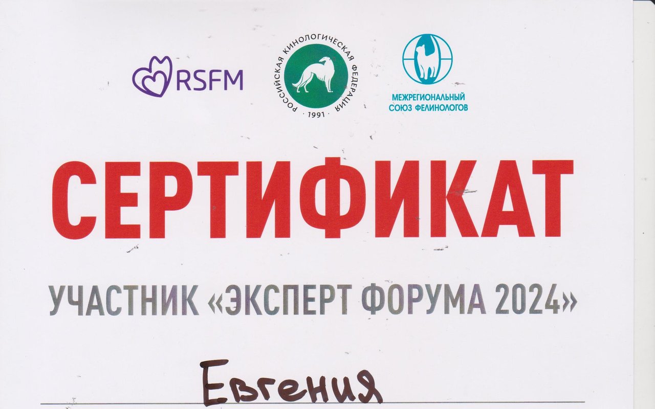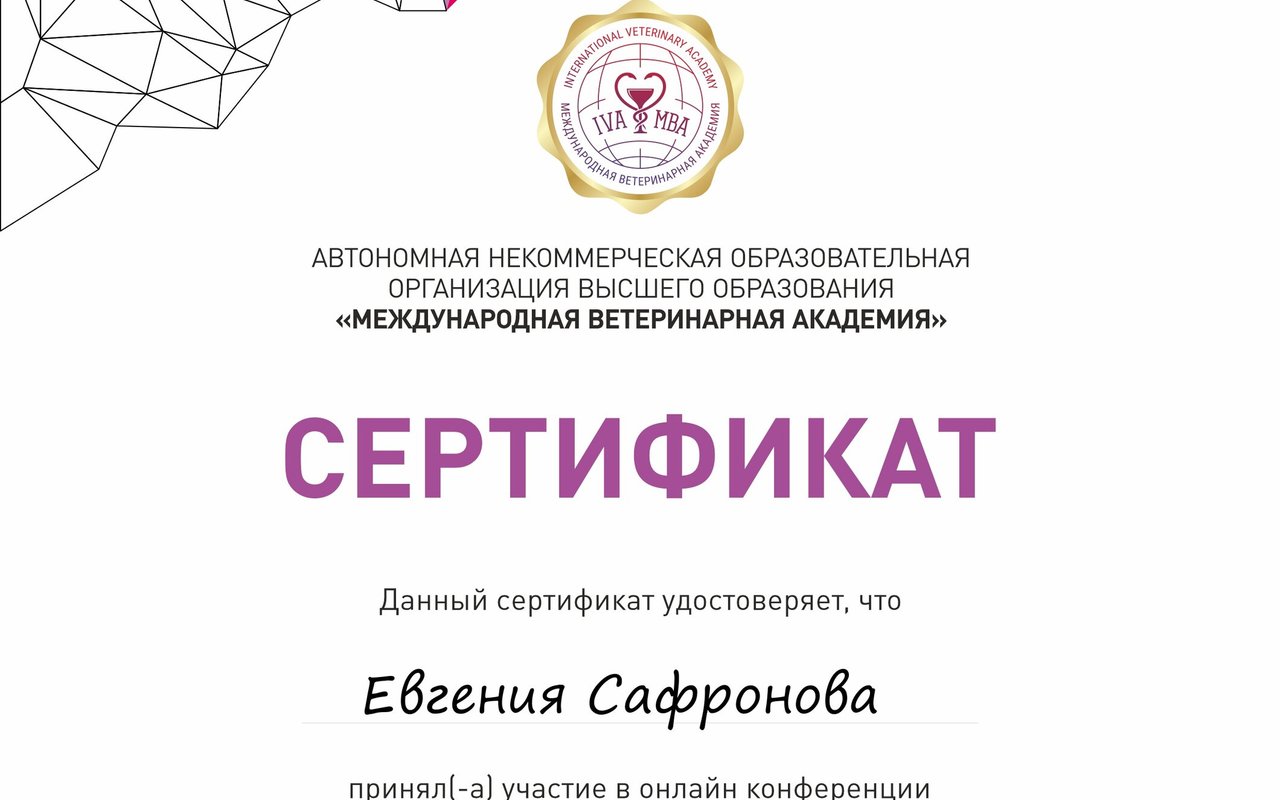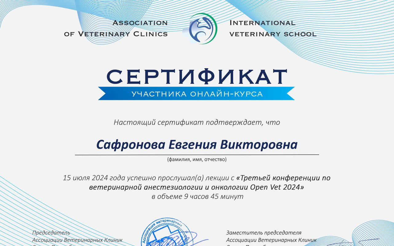 2007 — Сертификат участника 15 Всероссийского ветеринарного конгресса удостоверяет: за указанный период времени пройден курс повышения квалификации по теме «Организация ветеринарного дела». Диагностика, лечение и профилактика болезней животных в объеме 30 часов. С 21 по 23 апреля 2007 года (г. Москва)