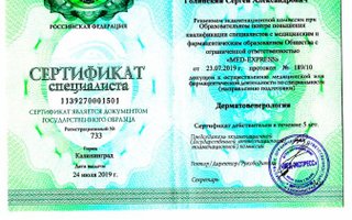 2019г. - прошел сертификационное повышение квалификации в Образовательном центре повышения квалификации специалистов с медицинским и фармацевтическим образованием Общества с ограниченной ответственностью "MED-EXPRESS" по специальности "Дерматовенерология"