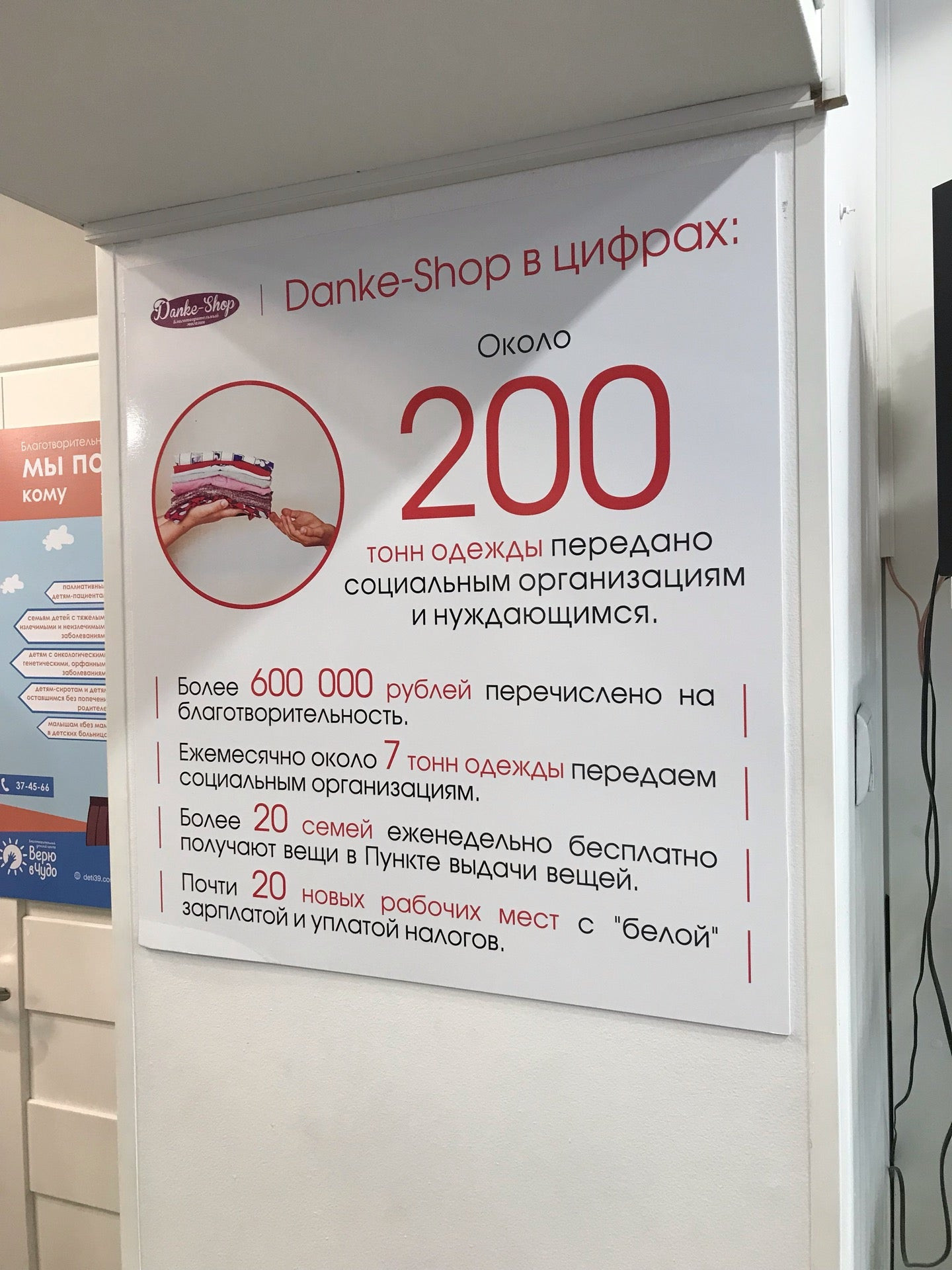 Достоинства: Здравствуйте, меня зовут Наталья. Я из Москвы частенько бываю в Калининграде, обнаружила для себя благотворительный магазин Данке Шоп на Житомирской. Очень интересный, много одежды по доступным ценам. Особенно мне понравился продавец Людмила, очень милая,комуникабельная девушка. Помогла мне с гардеробом, подобрала мне красивый образ. За что, безмерно ей благодарна.Из неё получился бы прекрасный имиджмейкер. Теперь, в следующий раз когда буду в Калининграде только к ней и буду