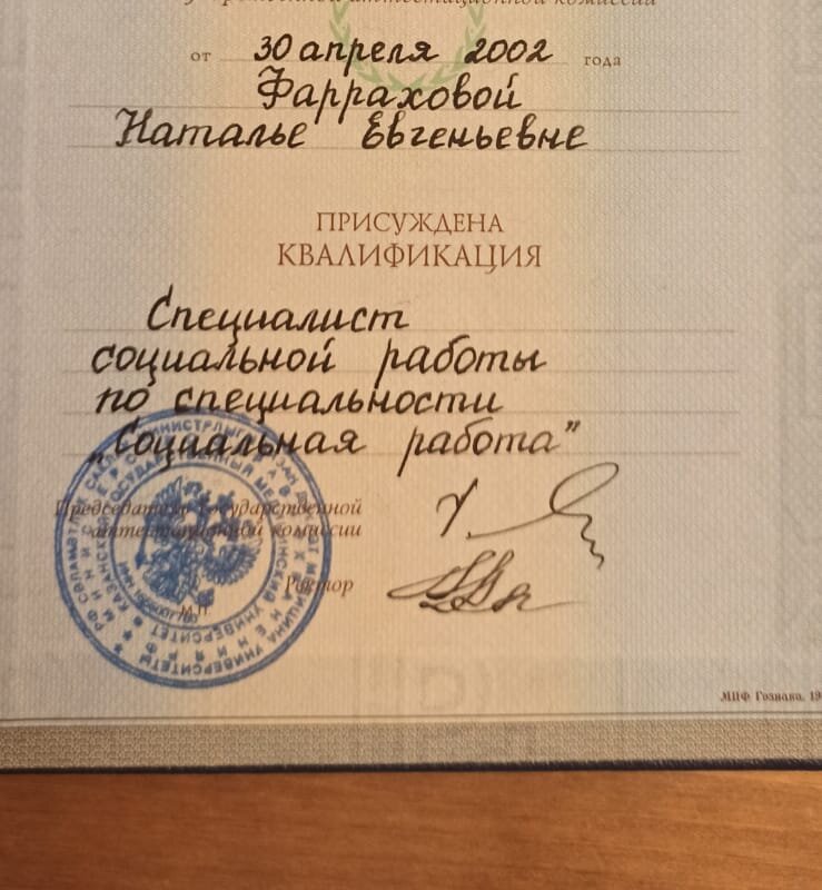 Фаррахова Наталья Евгеньевна – опытный мастер с многолетним стажем работы в сфере медицинского педикюра. Свой профессиональный путь начала в 1994 году, получив медицинское образование по специальности «Медицинская сестра». В 2002 году в Казанском Государственном Медицинском Университете Наталья Евгеньевна получает квалификацию Специалиста социальной работы. Знания, полученные за годы обучения в университете позволили находить общий язык с самыми тревожными и сложными клиентами.