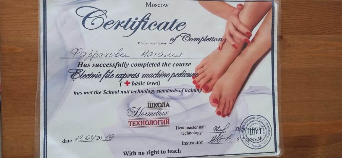 В 2019 году Наталья Евгеньевна поступает в Московскую Школу Ногтевых Технологий и осваивает образовательную программу мастера аппаратного педикюра медицинского класса, который фокусируется на гигиенический уход за ногтями и стопами, тем самым открыв для себя сферу профессионального ногтевого сервиса.