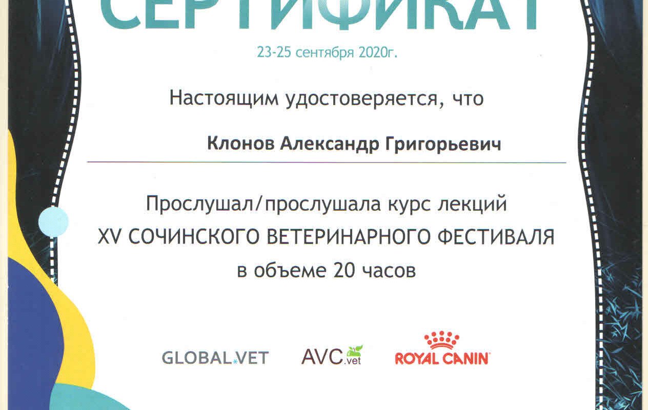Прошел постдипломное обучение, включая три модуля общей онкологии для мелких домашних животных и стажировку в ветеринарной клинике "Биоконтроль". Также прошел недельные курсы по УЗИ брюшной полости от Edu.vet и мастер-класс по абдоминальной хирургии в СВЦ «МЕДВЕТ».