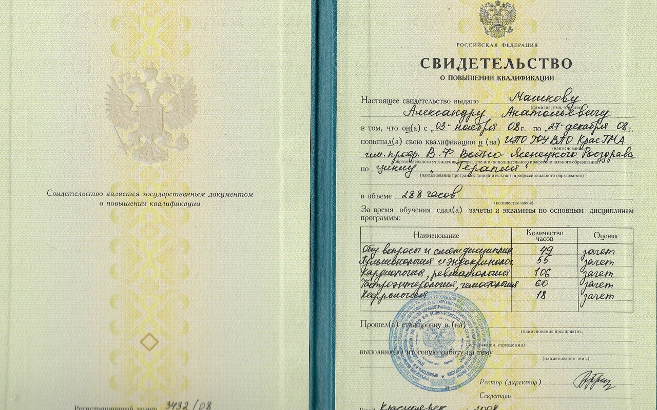 2007 — Красноярский государственный медицинский университет им. проф. Войно-Ясенецкого, цикл «Терапия»