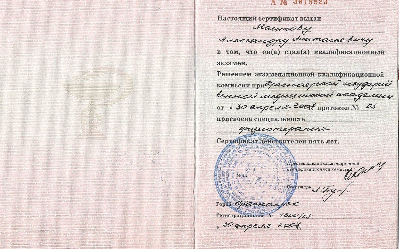 2007 — Красноярский государственный медицинский университет им. проф. Войно-Ясенецкого, цикл «Физиотерапия»