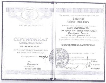 Действующий сертификат: Акушерство и гинекология, регистрационный номер № 3182/16 выдан ФГБОУ ВО КрасГМУ им. проф. В.Ф. Войно-Ясенецкого Минздрава Россиии.