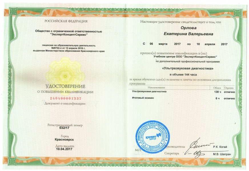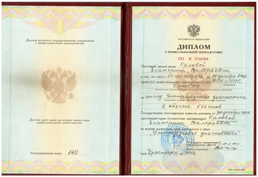 2002 — Красноярская государственная медицинская академия, диплом о профессиональной переподготовке по циклу "Ультразвуковая диагностика"
