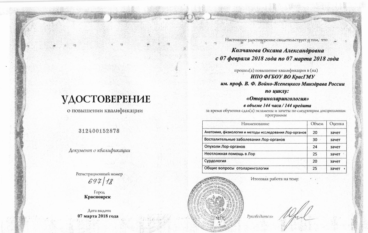 2018 — Красноярский государственный медицинский университет (отоларингология)