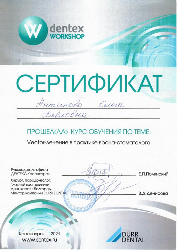 2021 — Сертификат о прохождении курса «Vector-лечение в практике врача-стоматолога»