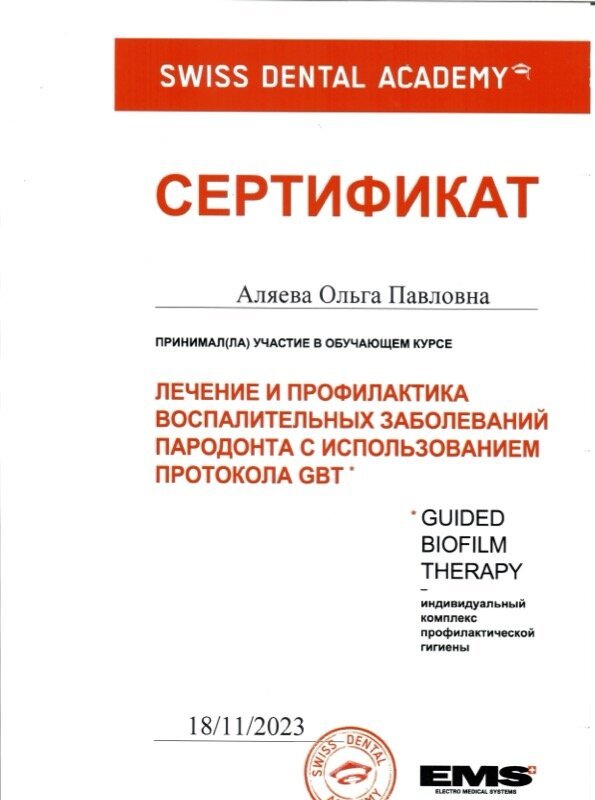 2023 — Сертификат "Лечение и профилактика воспалительных заболевания пародонта с использованием протокола GBT (на аппарате Air-Flow Prophylaxis Master)"