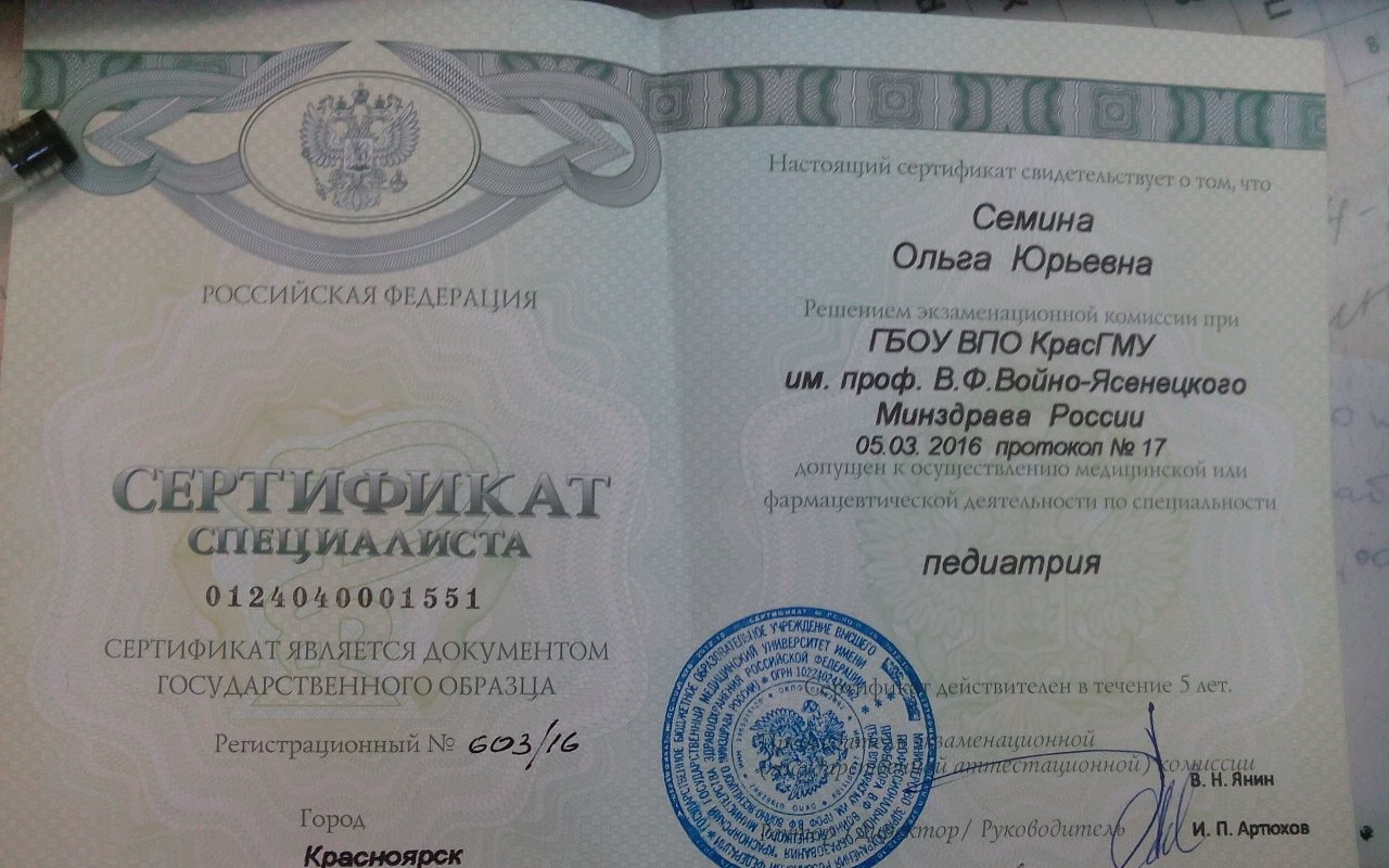 2016 — Красноярский государственный медицинский университет (педиатрия)