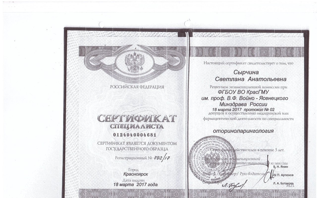 Имеет сертификат специалиста № 1154242402765 по специальности «Оториноларингология» действующий до 03.04.2025 г.