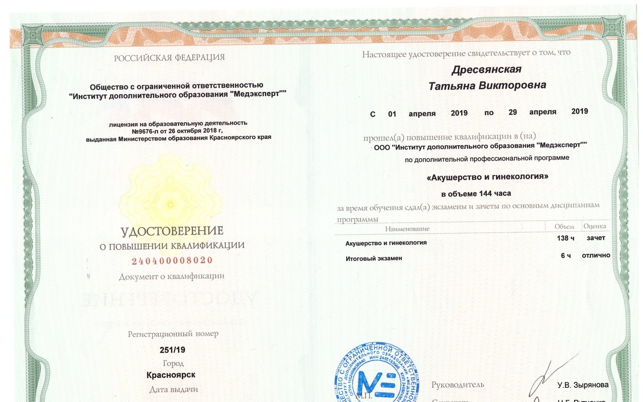 2014г – повышение квалификации по циклу: "Эндокринология в акушерстве и гинекологии", ИПО ГОУ ВПО «КрасГМУ», г.Красноярск