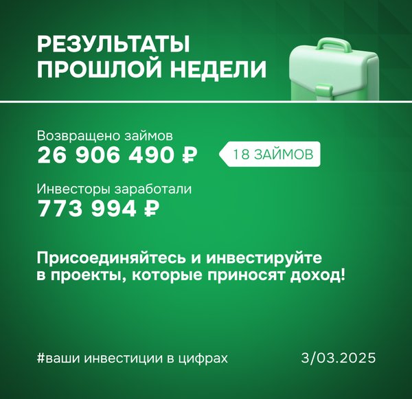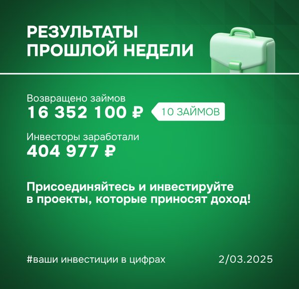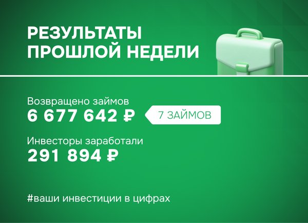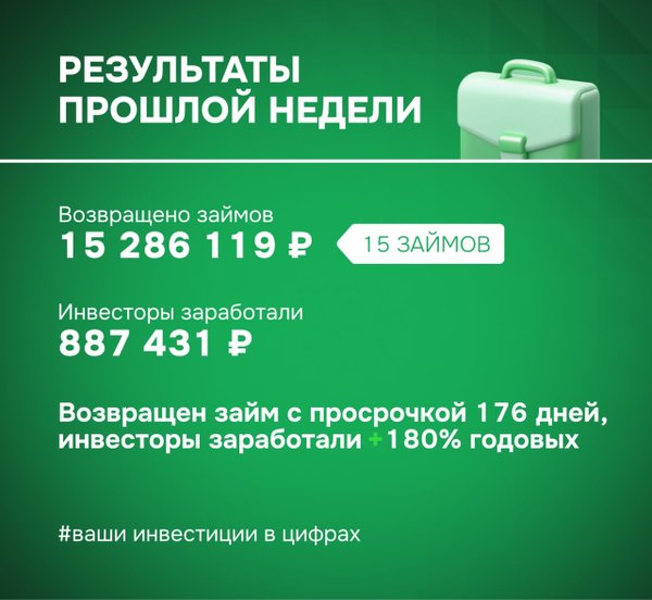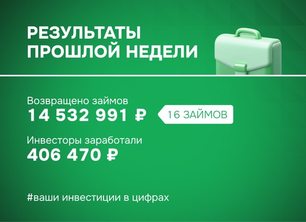 Результаты прошлой недели: ваши инвестиции в цифрах ▫ Возвращено займов: 15 286 119 ₽ (15 займов) ▫ Доход инвесторов: 887 431 ₽ ▫ Бонус для инвесторов: Возвращен займ с просрочкой 176 дней, инвесторы заработали по нему +180% годовых Присоединяйтесь и инвестируйте в проекты, которые меняют страну и приносят доход! Ваши деньги работают на развитие бизнеса и выполнение государственных контрактов. Команда ФИНИН ️