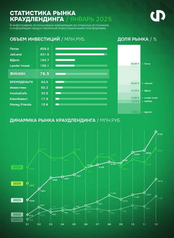 Наша платформа продолжает уверенно держать позиции лидера на рынке краудлендинга! Несмотря на общий спад объёма выдачи займов в начале года, мы сохраняем стабильные показатели, подтверждая надёжность и эффективность наших инструментов для инвесторов. Результаты января 2025 Общий объём выданных займов по рынку краудлендинга составил 1 527 млн рублей, показав снижение по сравнению с аналогичным показателем прошлого года. Традиционное замедление в январе Январь – это всегда снижение деловой активности после активного четвёртого квартала. Но… — Читать дальше