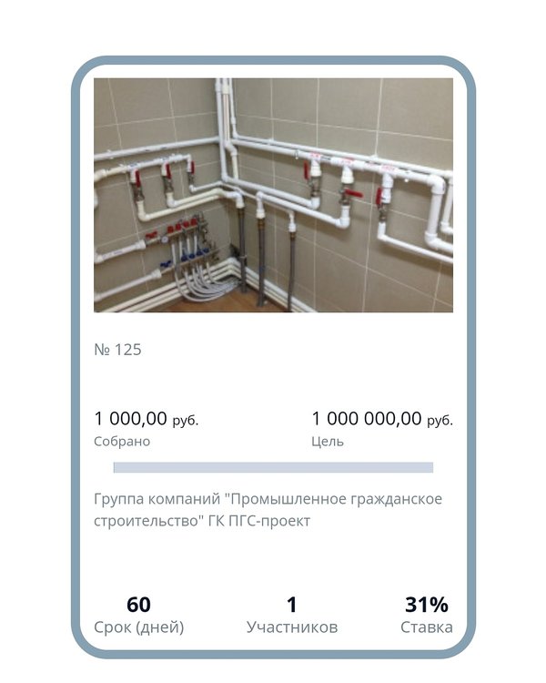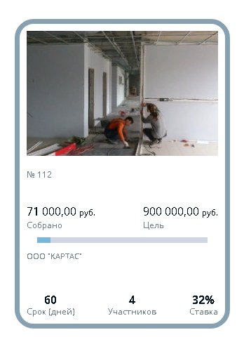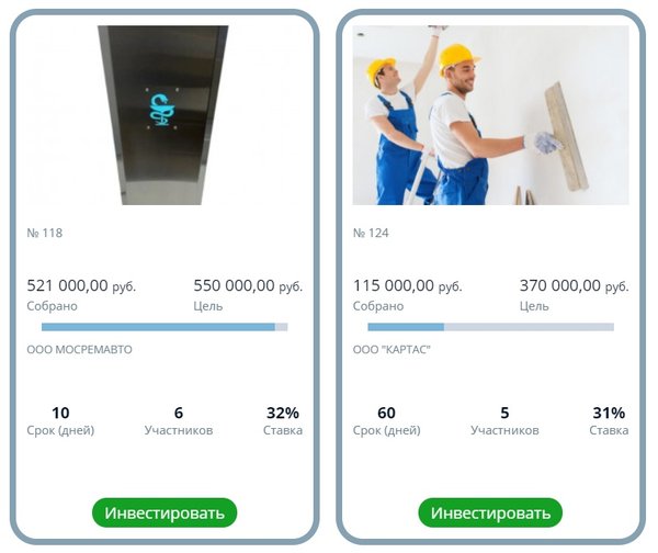 На нашей платформе по адресу размещен новый проект. Регистрируйтесь, создавайте профиль инвестора, пополняйте свой номинальный счет и размещайте любую сумму от 1 руб. под 31% годовых в надежный действующий бизнес.