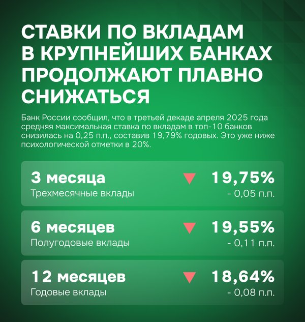 Ставки по вкладам в крупнейших банках продолжают плавно снижаться Банк России сообщил, что в третьей декаде апреля 2025 года средняя максимальная ставка по вкладам в топ-10 банков снизилась на 0,25 п.п., составив 19,79% годовых. Это уже ниже психологической отметки в 20%. Согласно последним данным (на 5 мая 2025 года): Трёхмесячные вклады — в среднем 19,75% годовых (снижение на 0,05 п.п. с 25 апреля), Полугодовые — 19,55% годовых (-0,11 п.п.), Годовые — 18,64% годовых (-0,09 п.п.). Индексы доходности вкладов также подтверждают снижение. В… — Читать дальше
