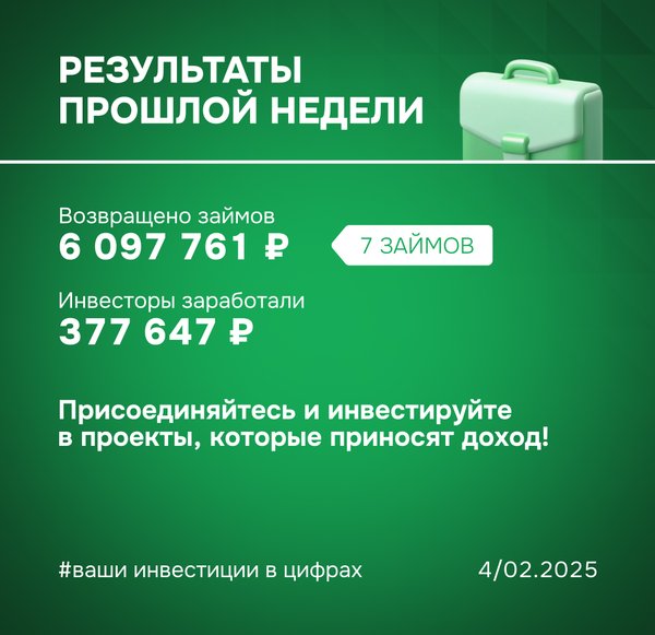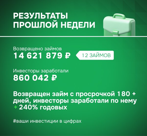 Результаты прошлой недели: ваши инвестиции в цифрах ▫ Возвращено займов: 14 621 879 ₽ (12 займов) ▫ Доход инвесторов: 860 042 ₽ ▫ Бонус для инвесторов: Возвращен займ с просрочкой 180 + дней, инвесторы заработали по нему 240% годовых Присоединяйтесь и инвестируйте в проекты, которые меняют страну и приносят доход! Ваши деньги работают на развитие бизнеса и выполнение государственных контрактов. Команда ФИНИН ️
