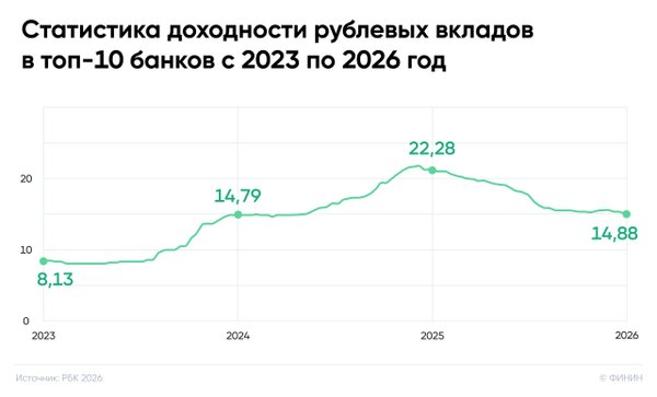 Статистика доходности рублевых вкладов с 2023 по 2026 год Уважаемые инвесторы, согласно исследованию РБК, средняя доходность по вкладам среди топ-10 банков на конец января 2026 года выглядит примерно так — 14,88% годовых. 13 февраля 2026 года будет очередное заседание ЦБ РФ по поводу ключевой ставки: если ее значение продолжат опускать, то доходность по вкладам и дальше будет снижаться (возможно, она дойдет до уровня 2023 года). Внимательно следите за изменениями ключевой ставки, помните об инфляции, не забывайте инвестировать и выбирайте пра… — Читать дальше