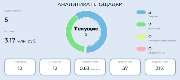 все время работы: 0,5 млн. руб. Средний срок займа: 48 дней Средняя доходность: 31% годовых Общее количество зарегистрированных инвесторов: 64 Общее количество зарегистрированных заемщиков: 38 Информация в отношении включения в реестр доступна по ссылке: