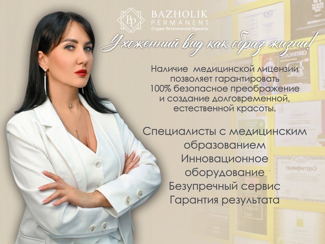 Сотрудники медицинской студии косметологии BAZHOLIK осуществляют коррекцию и окрашивание, татуаж, а также ламинирование бровей.