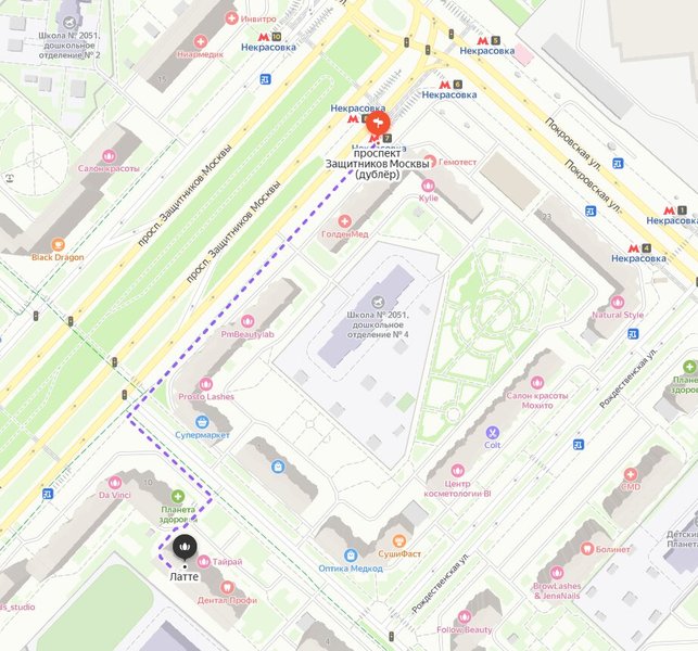 Метро Некрасовка (выход № 7). 3 минуты пешком по проспекту Защитников Москвы, на светофоре перейти дорогу, повернуть налево и войти во двор. Справа от вас первое крыльцо (во дворе) это уютный салон с качеством и сервисом как в центре Москвы:)