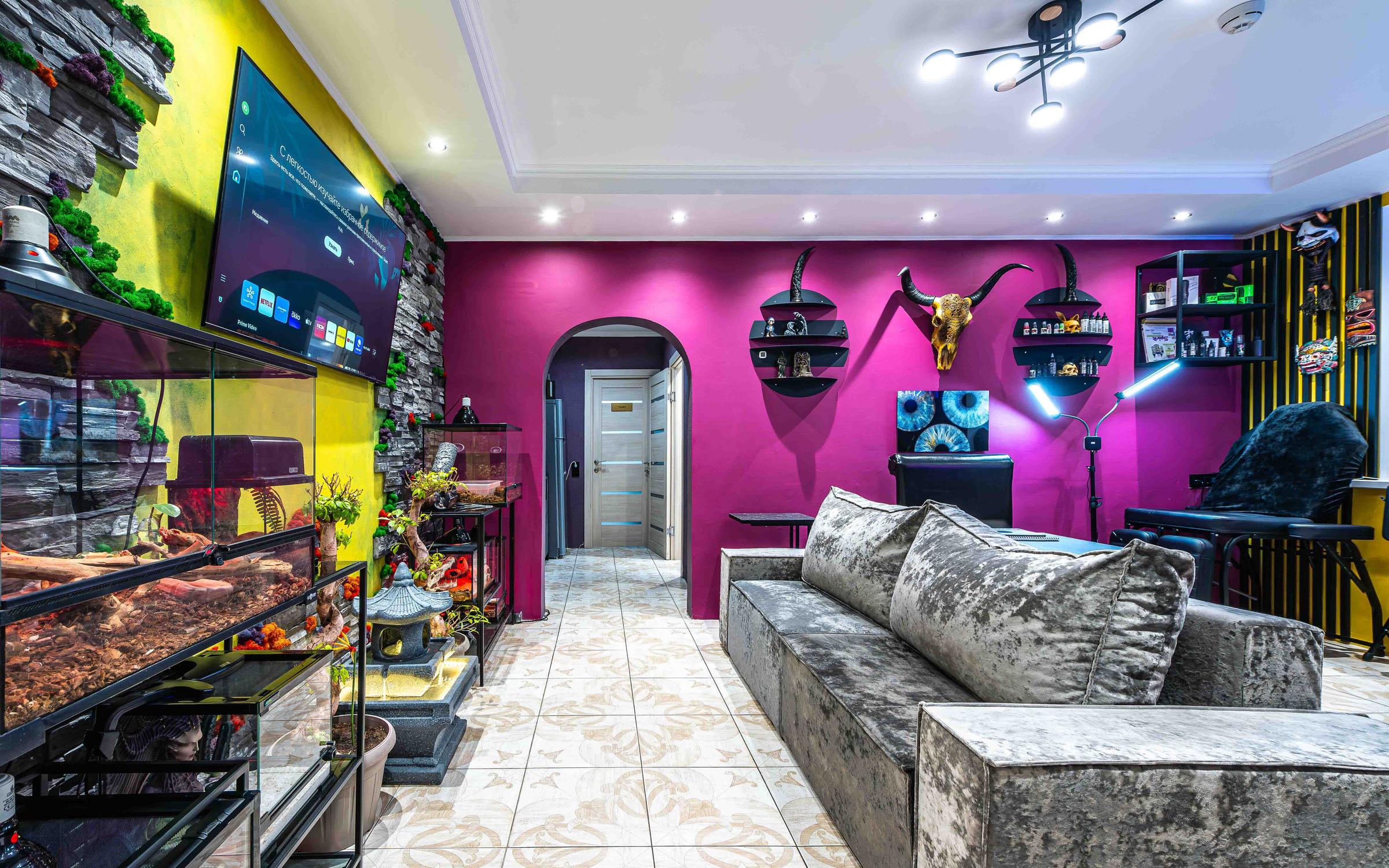При входе вас встречает удивительный интерьер, где современные искусственные инсталляции сочетаются с яркими красками и оригинальными декорациями, создавая атмосферу творчества и вдохновения.