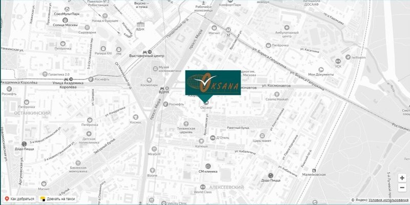 Гостиница «Оксана» расположена в 6 минутах ходьбы от метро ВДНХ. 27 минут на метро или 20 минут на такси от Комсомольского, Ярославского, Ленинградского вокзалов. 15 минут на такси или общественным транспортом от МЦД Рижская и Рижского вокзала.