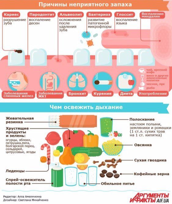 ализы, тест на хеликобактер пилори или ФГДС (Фиброгастродуоденоскопия). Способы борьбы с неприятным запахом помимо терапии, назначенной врачом, скорректируйте диету. Помните, избыток быстрых углеводов увеличивает количество налета на зубах и ведет к возникновению кариеса. Употребляйте в пищу побольше клетчатки. Свежая зелень, овощи и фрукты нормализуют работу кишечника и уменьшают неприятный запах изо рта. Но главное, вылечите заболевания, провоцирующие неприятный запах изо рта. А для этого запишитесь на приём к врачу-гастроэнтерологу.
