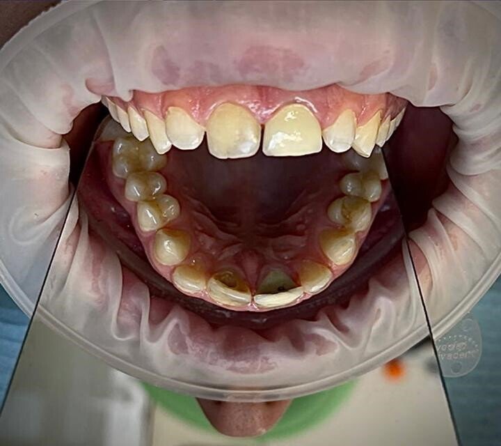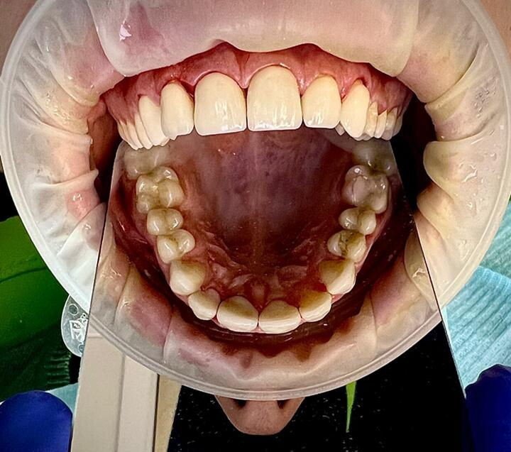 Профессиональная гигиена у пациента c налётом Пристли, вся группа зубов.