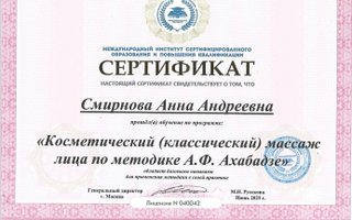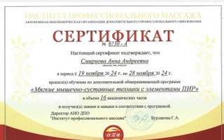 МассажистСпециалист Анна Андреевна Смирнова работает в качестве массажиста. Вернуть себе бодрость можно несколькими способами, и массаж - самый приятный из них. Используя разные техники и приемы, такие, как антицеллюлитный, баночный, локальный, корректирующий, масляный, общий, расслабляющий, турецкий, медовый, спа массаж, массаж стоп, рук, спины, лица, ног, головы, массаж по Ахабадзе, массаж в четыре руки, специалист способен вернуть тонус мышцам или же расслабить защемленные участки тела. Анна Андреевна Смирнова как специалист в области массажа поможет вам прийти в форму. Воздействуя на различные зоны, она способствует стимулированию тока крови в организме, что оказывает положительный эффект на работу многих органов. Таким образом вы сможете не только укрепить свое здоровье, но и получить заряд бодрости на весь день.